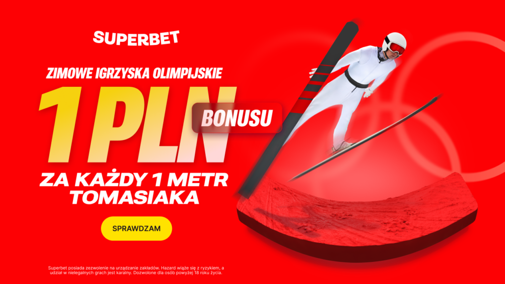Bukmacher Superbet przygotował akcję związaną z występem Kacpra Tomasiaka podczas konkursu na dużej skoczni na Zimowych Igrzyskach Olimpijskich 2026 – za każdy metr skoku Polaka uczestnicy mogą otrzymać 1 zł bonusu, niezależnie od wyniku postawionego zakładu.